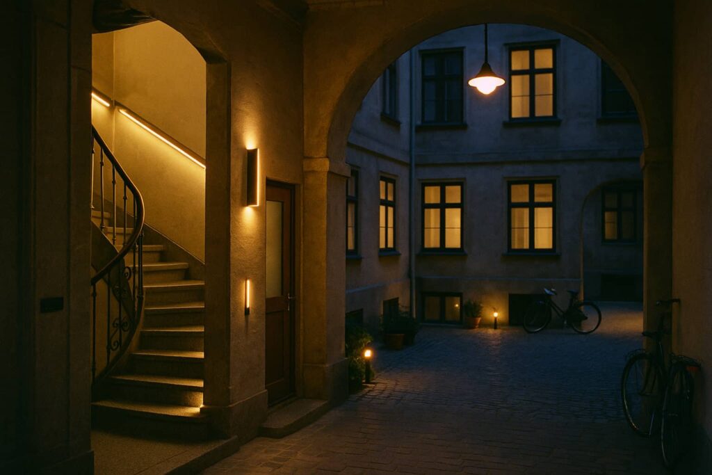 Principper for belysning i ældre ejendomme: Skab tryghed, komfort og æstetik i opgang og port med moderne løsninger.